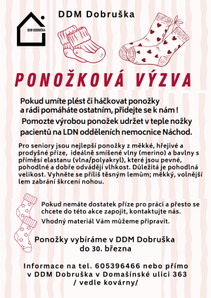 Pokud umíte plést či háčkovat ponožky a rádi pomáháte ostatním, přidejte se k nám! Pomozte výrobou ponožek udržet v teple nožky pacientů na LDN oddělení nemocnice Náchod.